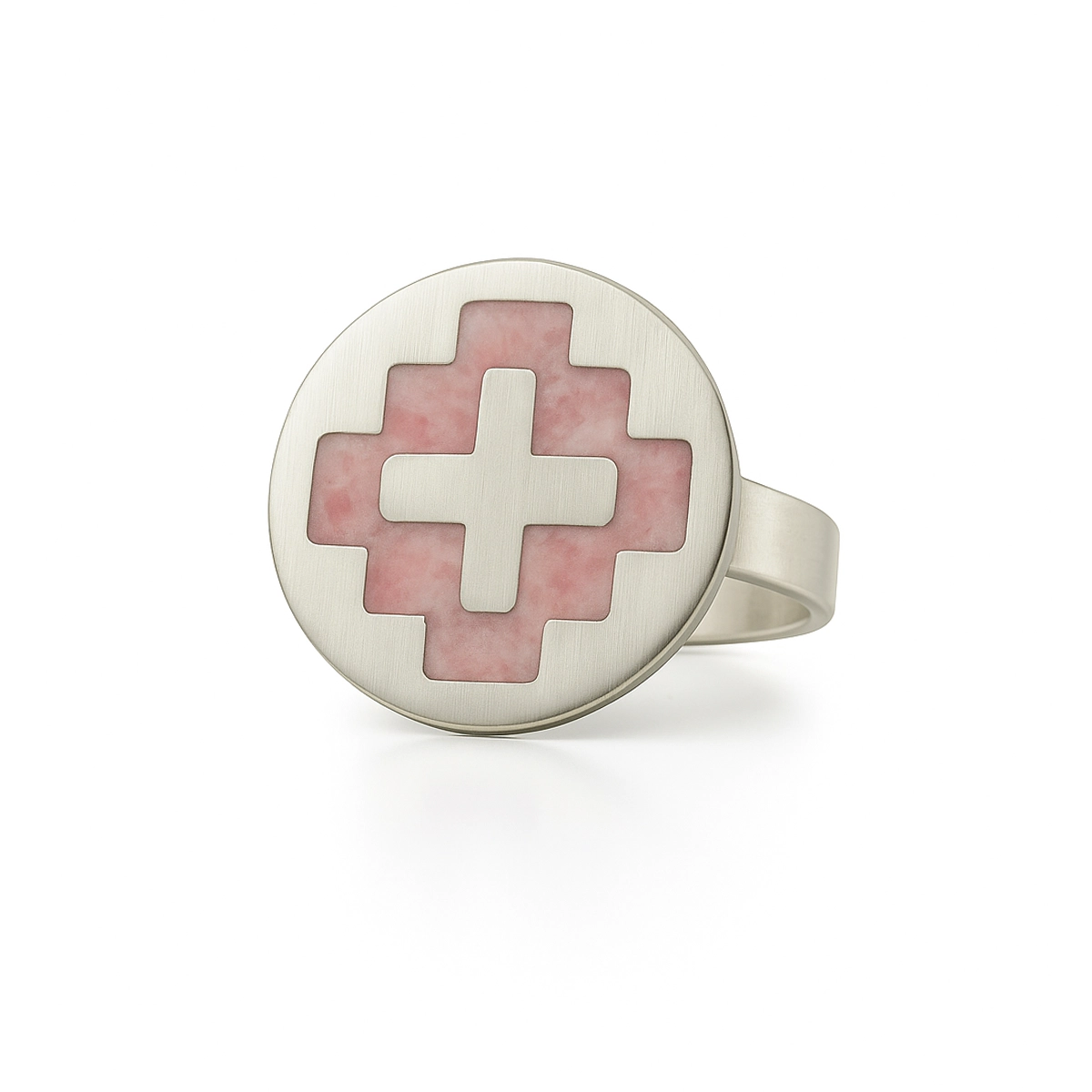 El Anillo Chakana está confeccionado en plata 925 con incrustación de rodocrosita reconstituida, piedra nacional de Argentina que aporta su característico tono rosado.