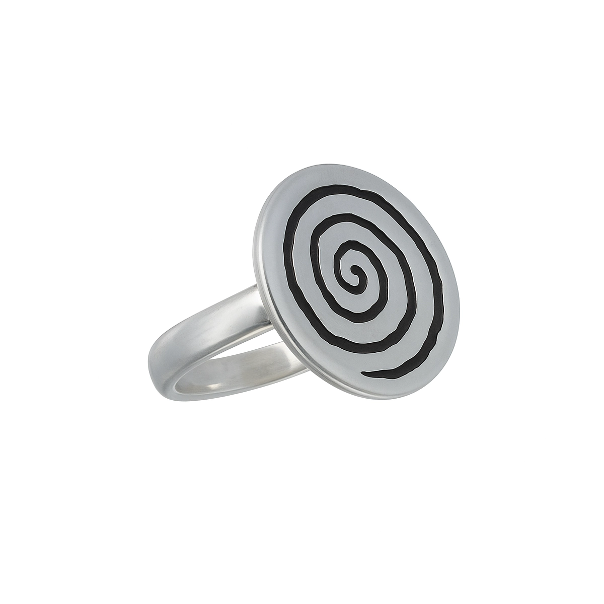 Su montura circular plana de 21,5 mm de diámetro se convierte en el lienzo perfecto para un espiral de curvas irregulares, símbolo ancestral de la energía vital, el movimiento continuo y la conexión con lo eterno.