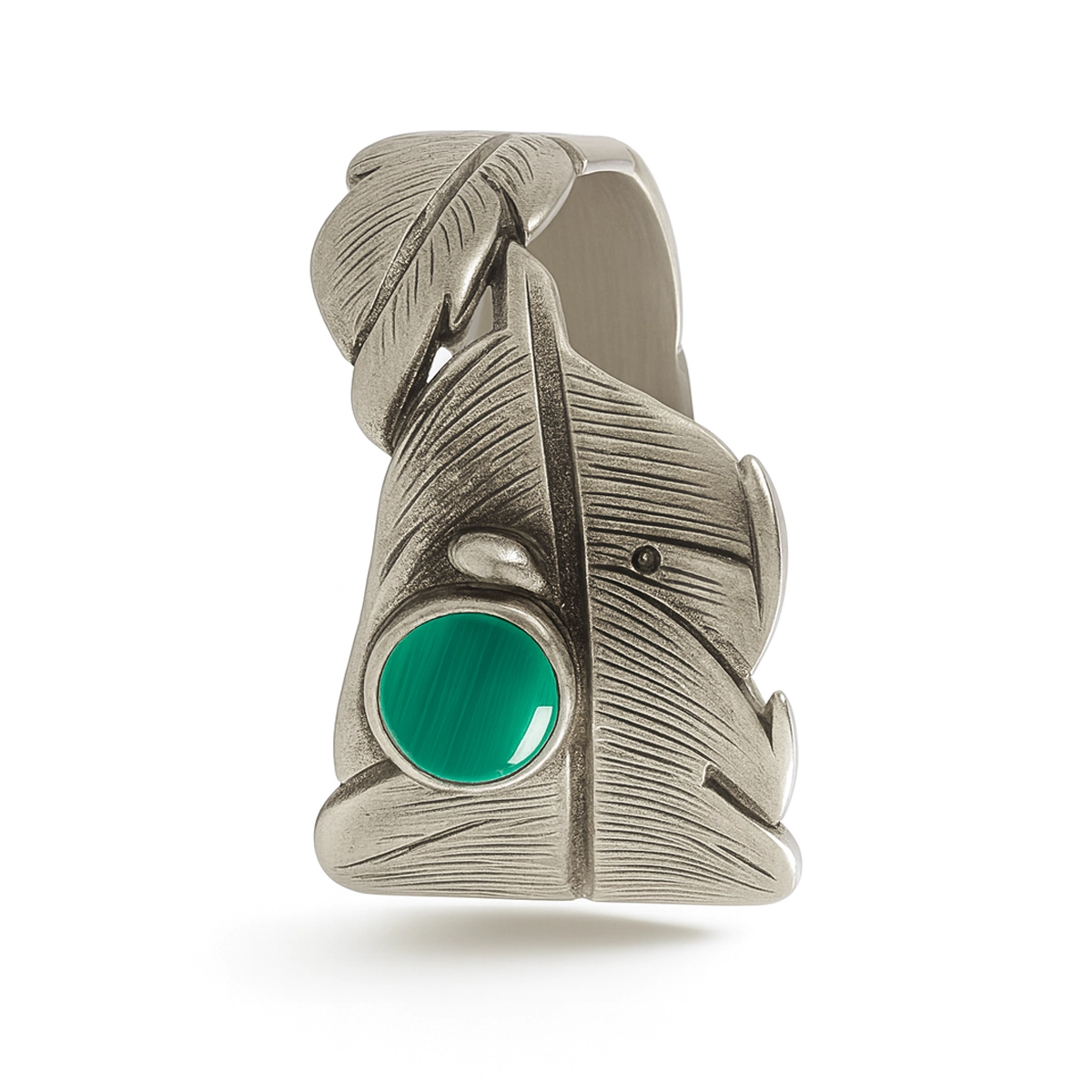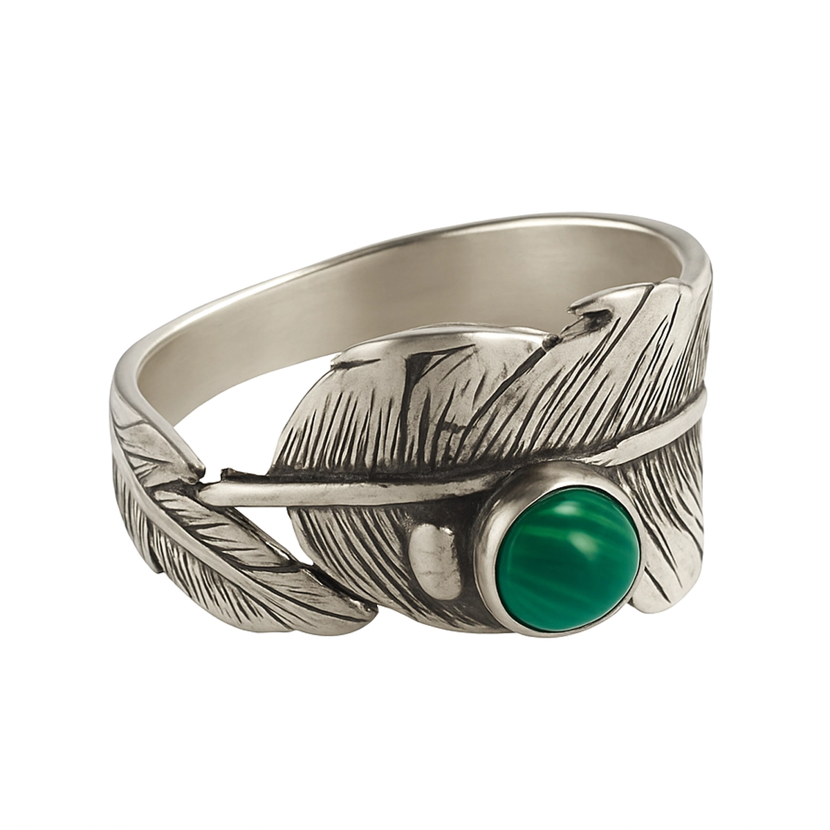 Significado: La pluma como símbolo de poder y la malaquita como piedra de transformación y ene
