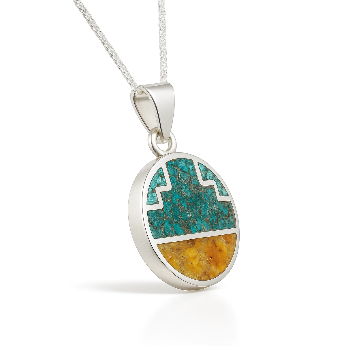 El Dije Chakana está confeccionado en plata 925, con un diseño circular que integra detalles en turquesa, crisocola y ámbar, generando un contraste vibrante y lleno de energía.