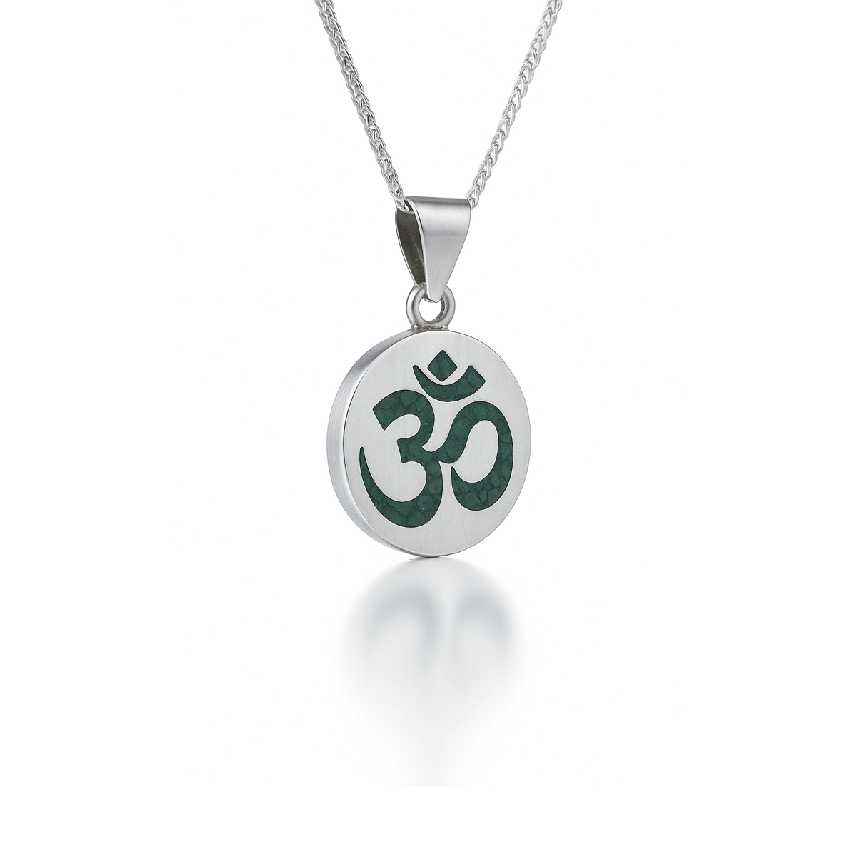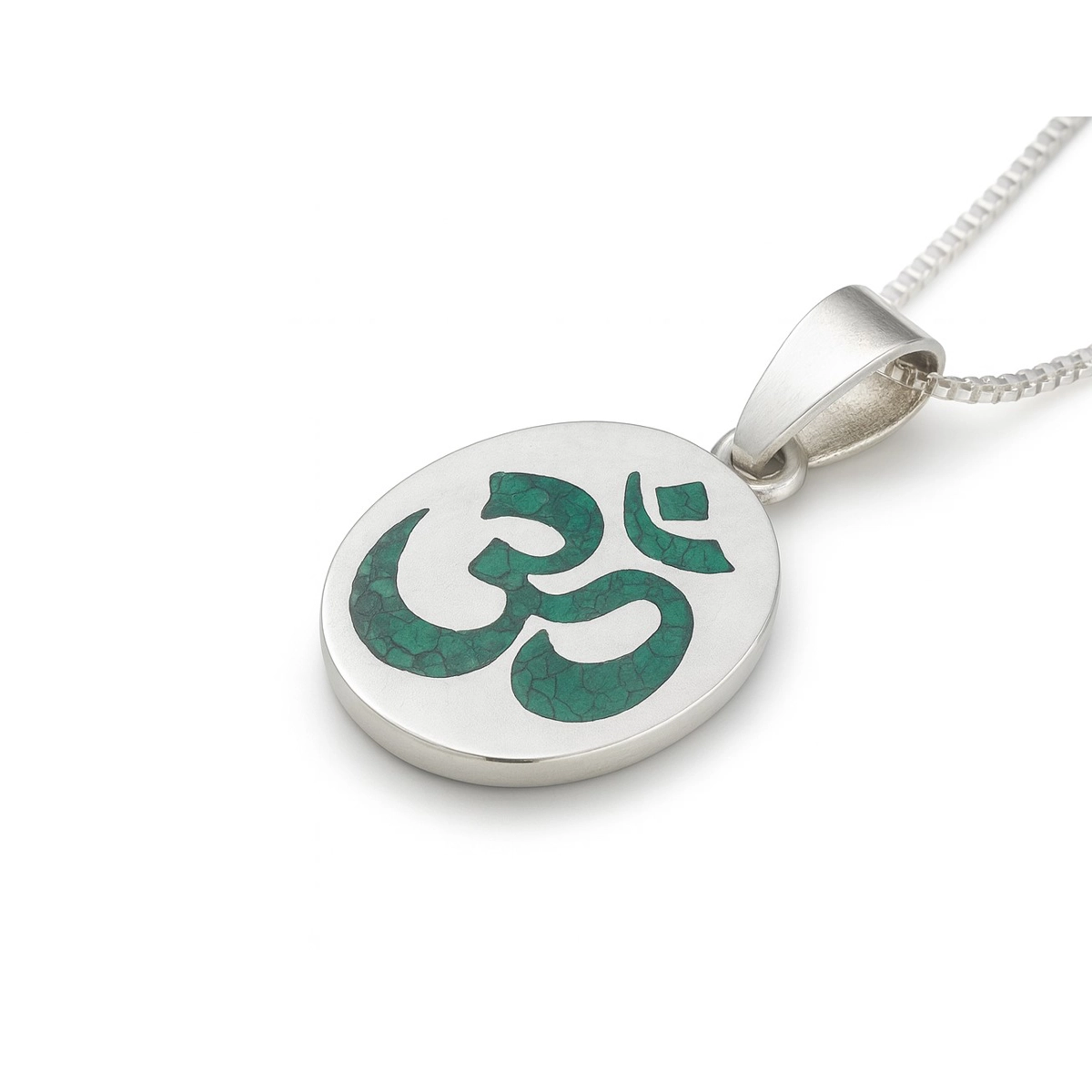 El Dije Om está confeccionado en plata 925, con detalles de malaquita reconstituida que realzan la fuerza y el contraste de este símbolo sagrado.