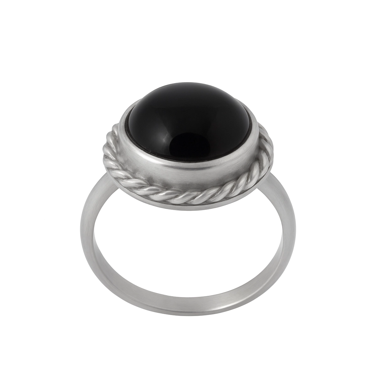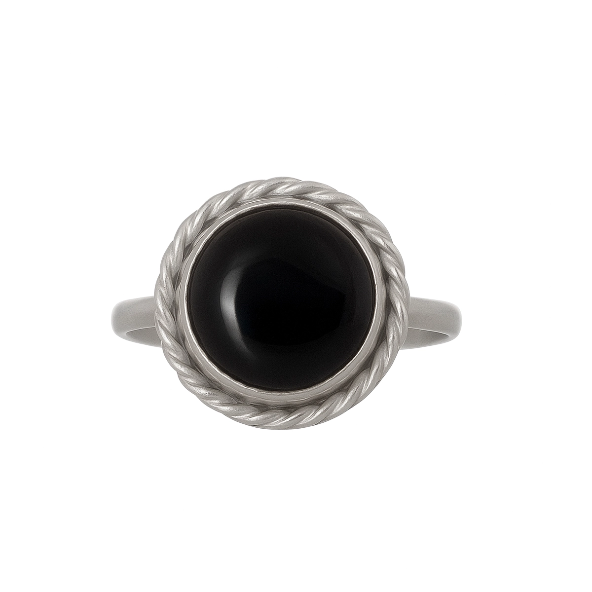En el centro, una piedra ónix redonda de 10 mm de diámetro aporta profundidad y carácter con su tono oscuro y brillante.